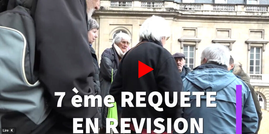 délibération 7 ème requête en révision Publication publiée :13 mars 2026 Post category:Actualité / Vidéo 19 février 2026 attente du délibéré au tribunal de Paris avec les images de Jacques Merlaud Vous devriez également aimer Un 5 octobre vers la victoire ! 12 octobre 2023 Inauguration d’une Place Mis et Thiennot sur la commune de Parnac (36) 9 mars 2013 Ekiden 2016 : même au pas de course, le combat continue… 6 novembre 2016
